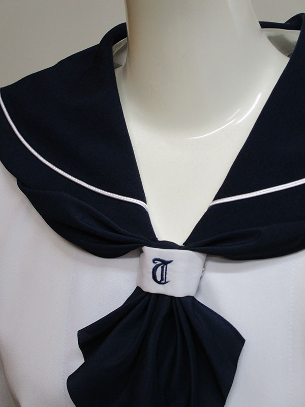 紺襟・カフスに白1本ライン、紺色スカーフリボン付、前スナップ止め、スカーフ止めに刺しゅう、ヒダ24本