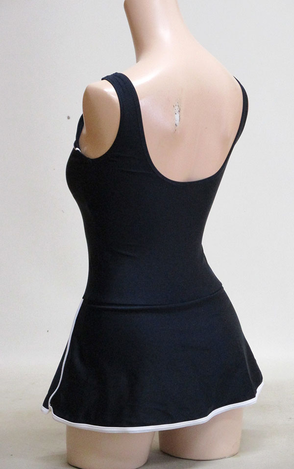 ポリエステル85%・ポリウレタン15%、フリル付き・名札付き、紺×ホワイト