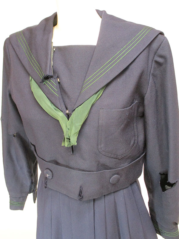 襟等に緑3本ライン、サイドファスナー、緑系スカーフ付、上衣・スカーフヤブレあり、スカートホック無し・スナップのみ
