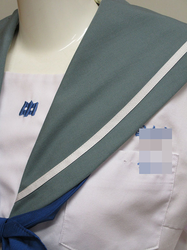 グレー襟に白1本ライン、青色スカーフリボン付、胸当てに刺しゅう、左胸に校名・名前刺しゅう、前スナップ止め、ヒダ20本