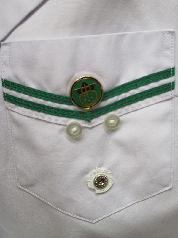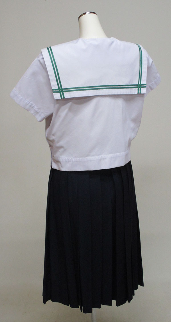 襟等に緑2本ライン、緑色ネクタイ・バッチ付、サイドファスナー、ヒダ24本