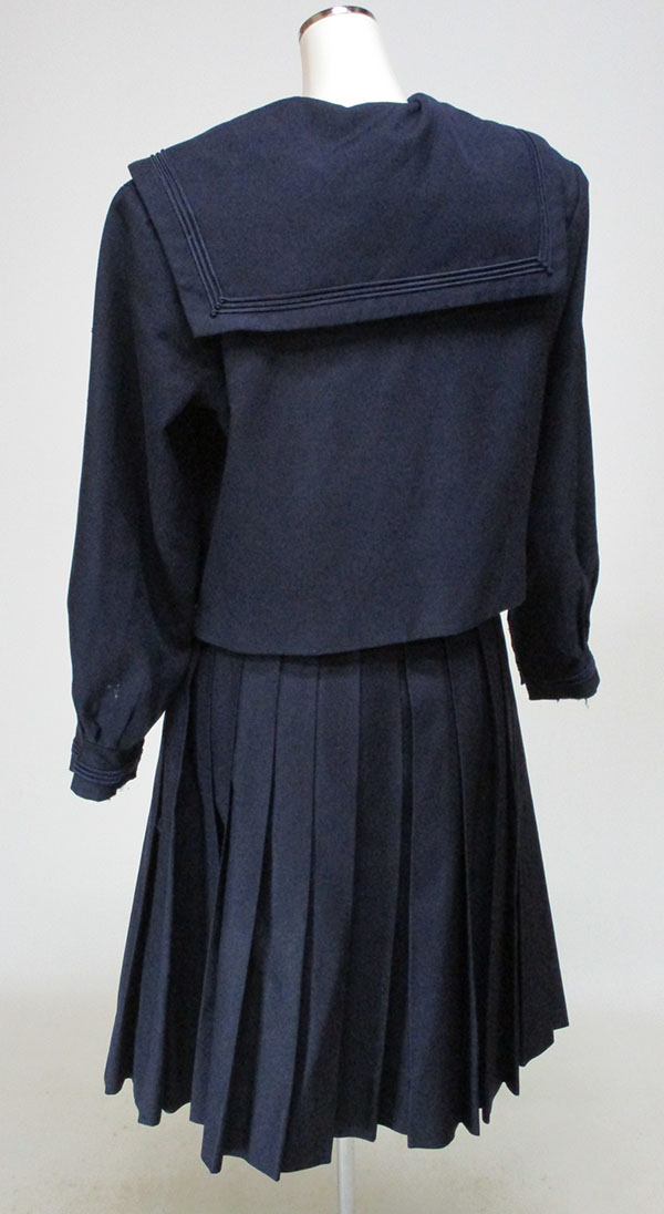 襟等に紺3本ライン、サイドファスナー、紺色スカーフ付、スカーフ止めに刺しゅう、ヤブレ・イタミあり、スカートヤブレ・イタミあり、ヒダ24本