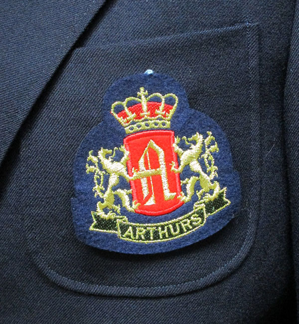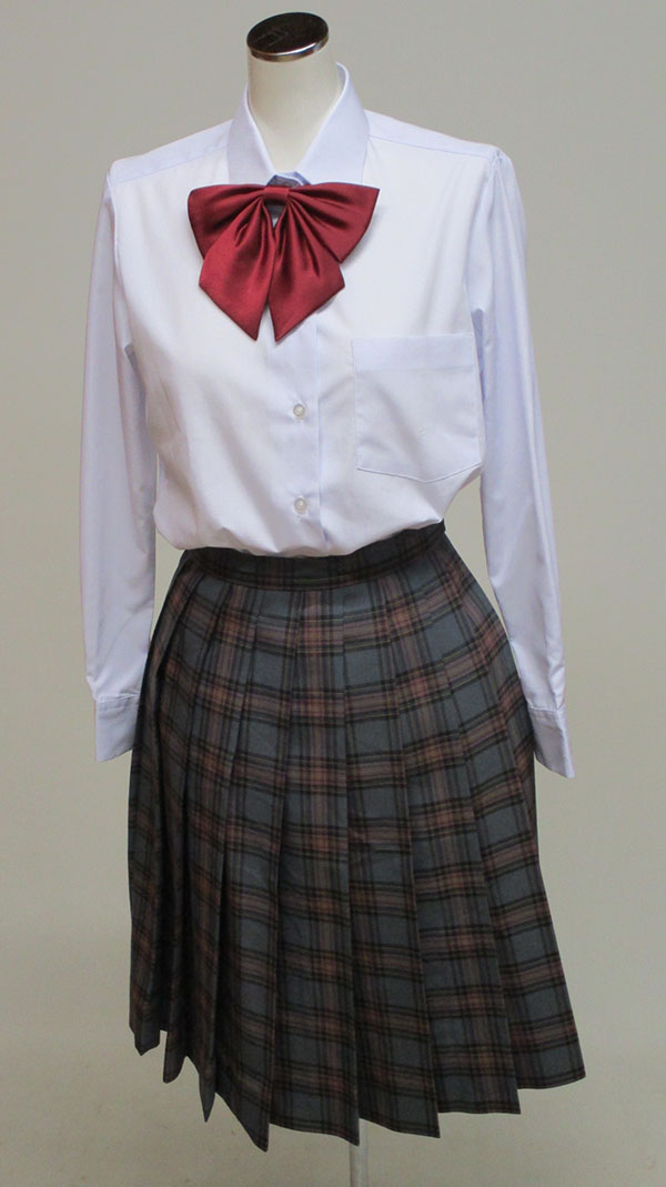 ブレザー:紺、胸ポケットにエンブレム付、エンジサテンリボン付 スカート:グレー×ピンク他チェック、ヒダ18本