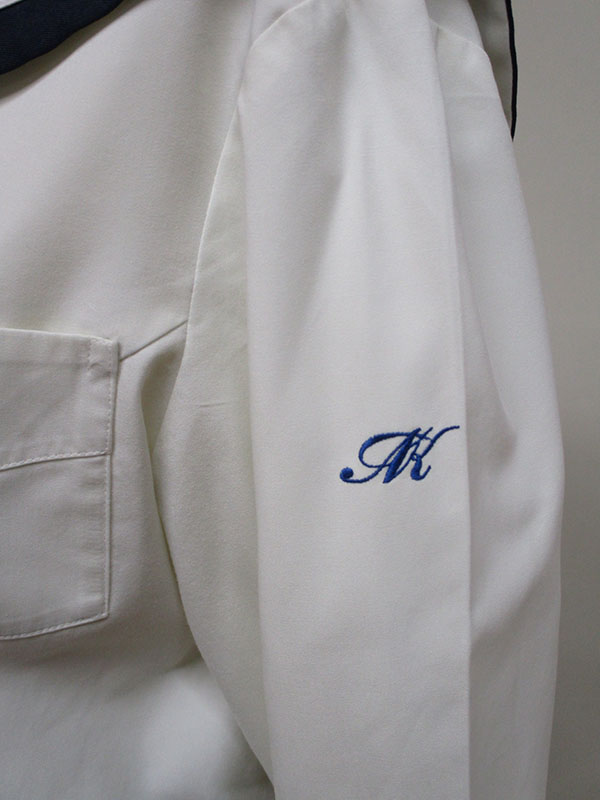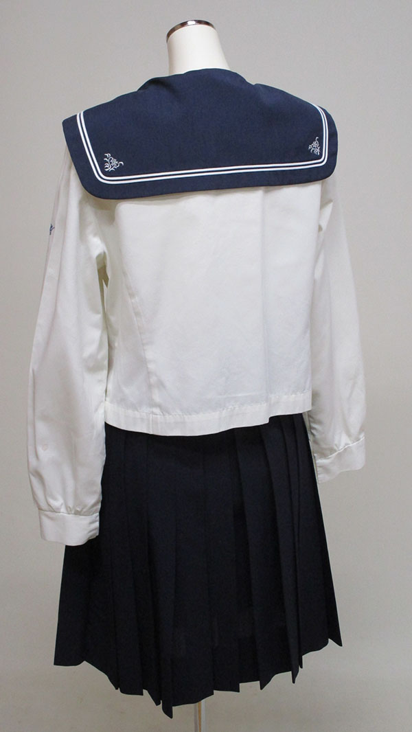 紺襟に白2本ライン、紺サテンリボン付、左袖・後ろ襟に刺しゅう、前ボタン開き、ヒダ24本