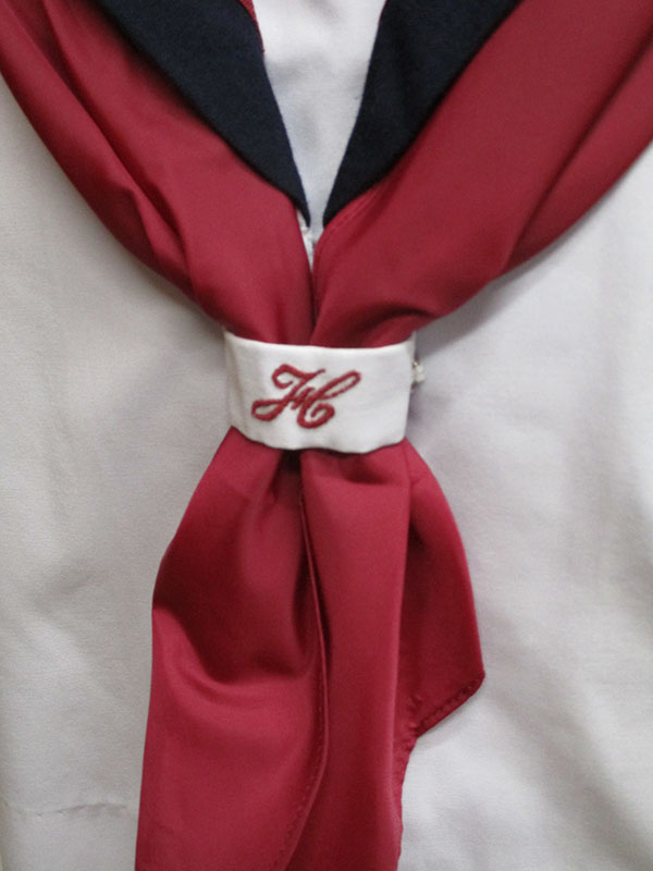 紺襟にエンジ2本ライン、エンジスカーフ付、スカーフ止めに刺しゅう、前ファスナー、ヒダBOX14本