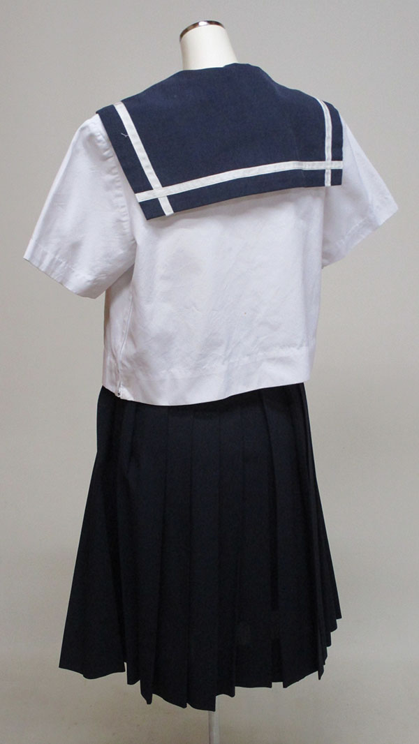 紺襟に白1本ライン、白色スカーフ付、少々汚れあり、サイドファスナー、ヒダ24本