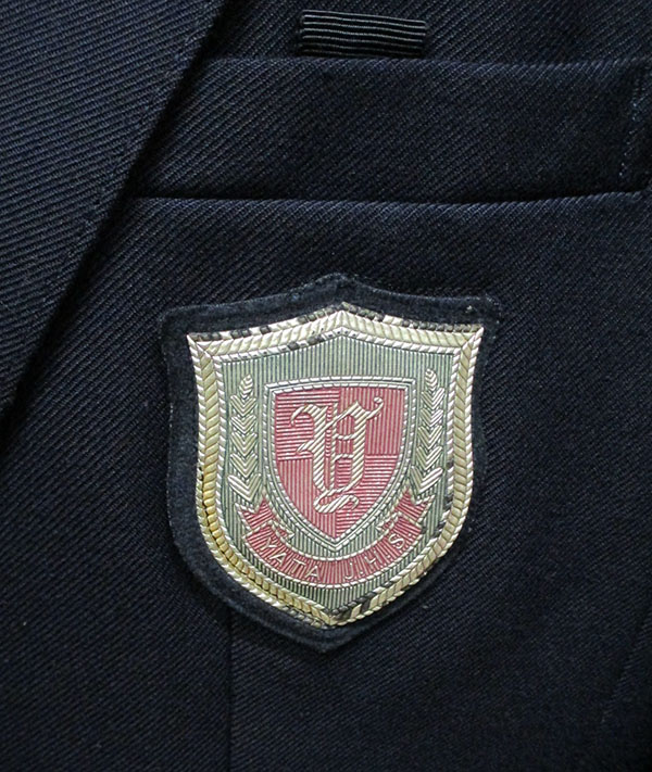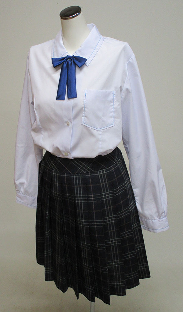 ブレザー:紺、胸ポケットにエンブレム付、紺色サテンリボン付 ブラウス:青色ステッチ入り スカート:紺系チェック、穴あきあり、ヒダ20本