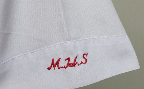 襟に白3本ライン、赤色スカーフ付、左袖に刺しゅう、サイドファスナー、ヒダ24本