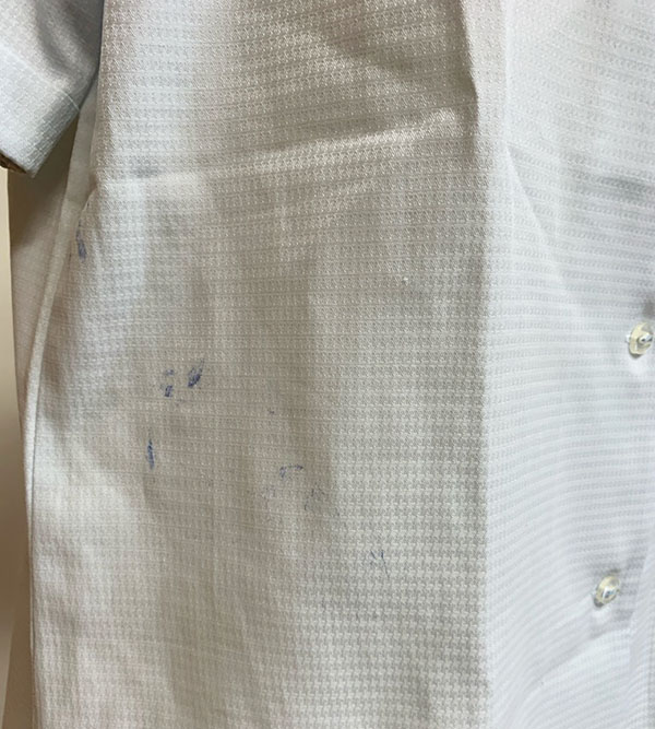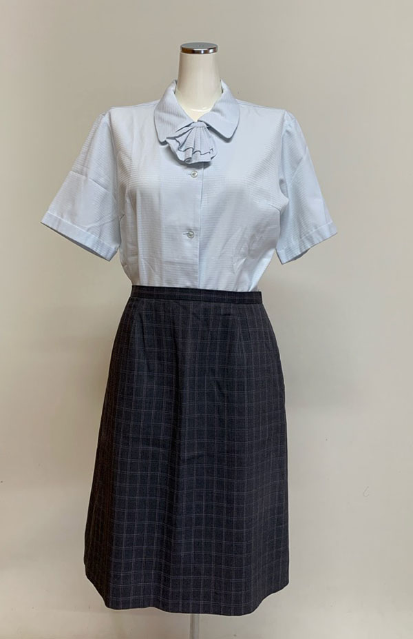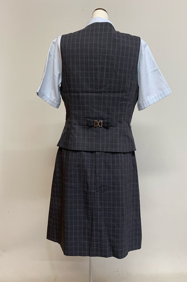 ベスト・スカート:グレー×ピンク・ホワイト格子柄、ブラウス:サックス、共布タイ付き、青色塗料汚れあり