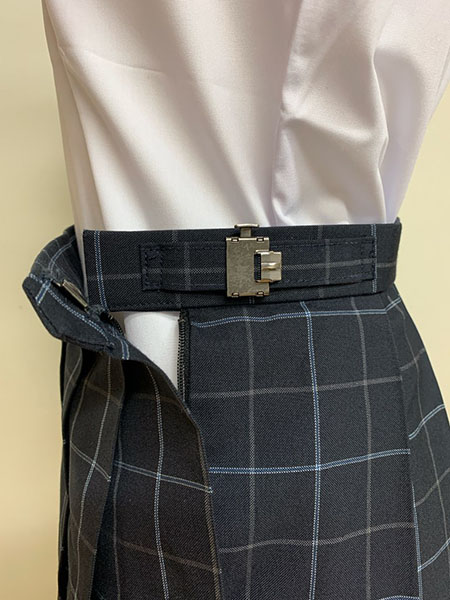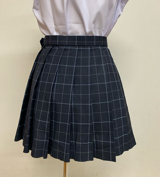 毛50%・ポリエステル50%、ダークネイビー×サックス×グレーチェック柄、ヒダ16本、ポケットあり