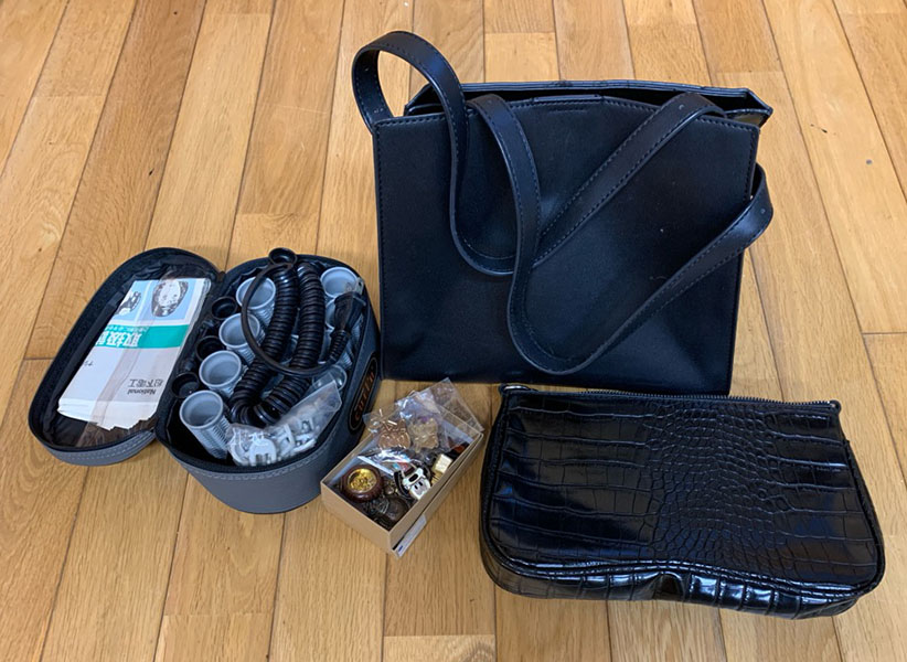 バッグ2つ、ホットカーラー(動作確認はしておりません)、ピンバッジ・キーホルダー等