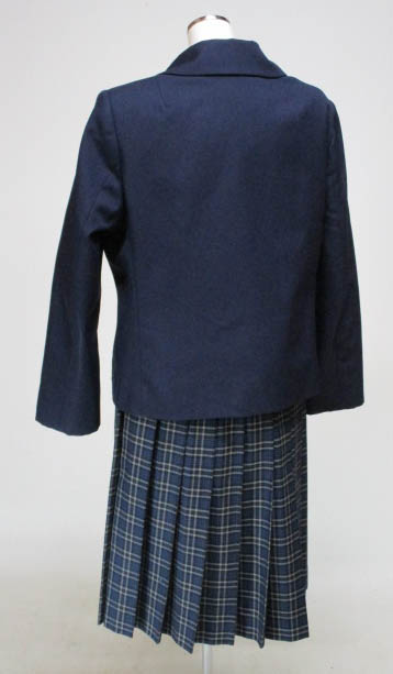 ジャケット:紺、前ダブル、エンジヒモタイ付 スカート:紺系チェック、ヒダ20本