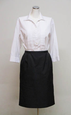 ベスト・スカート:ブラック・ピンストライプ柄、ブラウス:ホワイト・前ピンタック入り