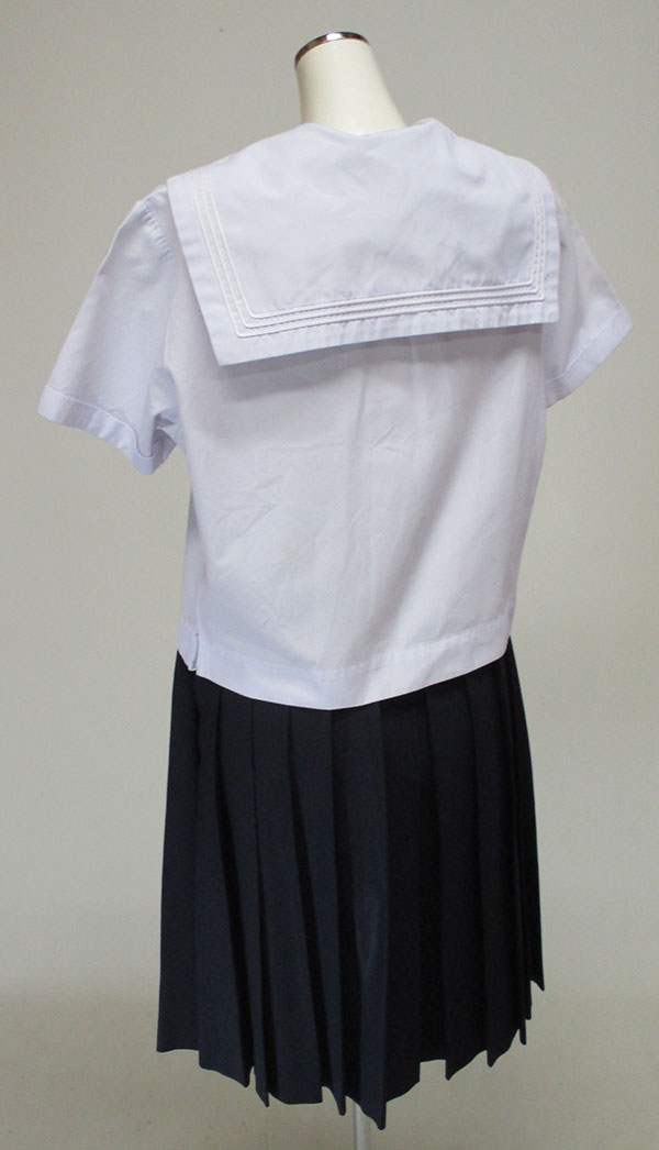 襟等に白3本ライン、紺色スカーフ付、胸当てに刺しゅう、シミ汚れあり、サイドファスナー