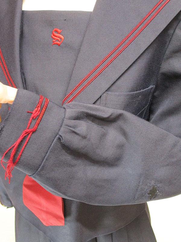 襟等にエンジ2本ライン(袖ラインほつれ)、サイドファスナー、エンジネクタイ付、胸当てに刺しゅう、生地イタミあり、裏地ほつれ・イタミあり、ヒダ24本