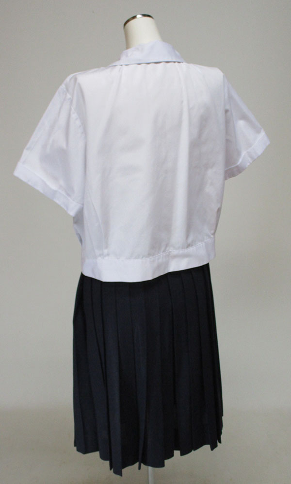 上衣:前ボタン開き、マークあり、エンジストライプリボン付 スカート:紺、ヒダ28本