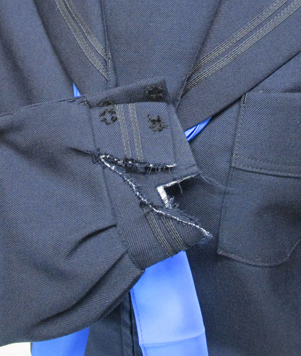 襟等に黒2本ライン、前ファスナー、青色帯スカーフ付、胸当て・袖スナップ無し、袖ヤブレあり、ヒダ24本