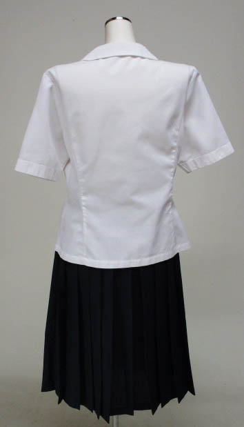 上衣:前ボタン開き、茶色サテンリボン付 スカート:紺、ヒダ24本