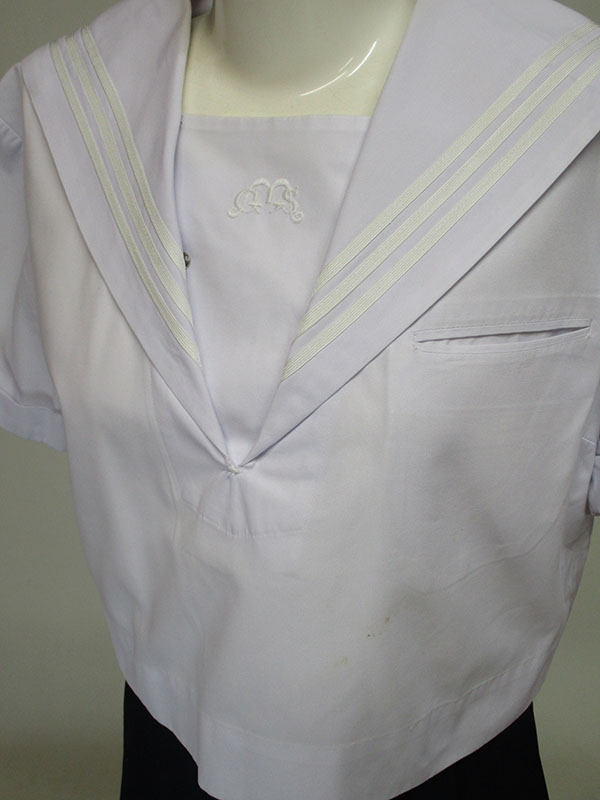 襟に白3本ライン、胸当てに刺しゅう、かぶるタイプ、少々汚れあり